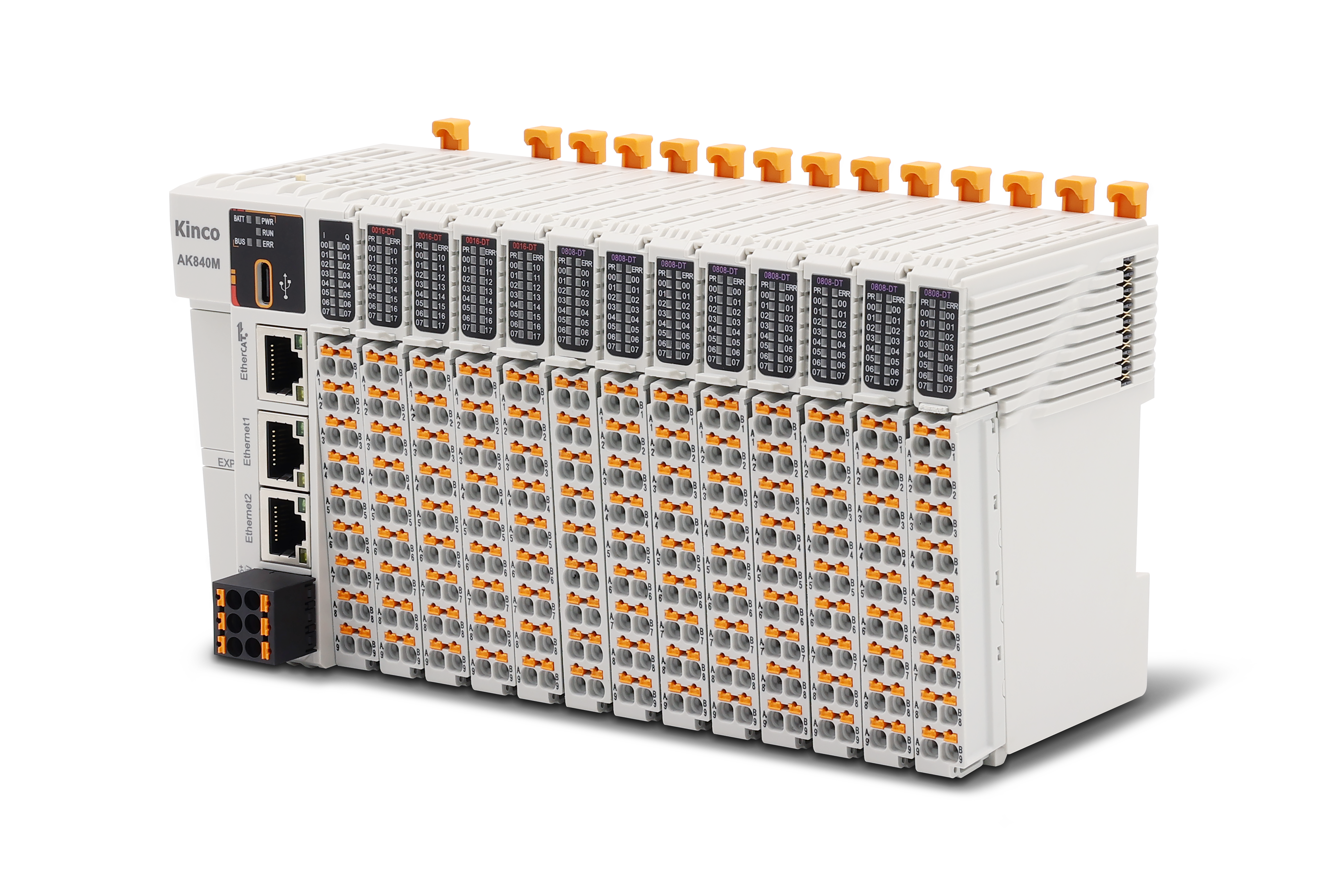 - Компактный дизайн: модули расширения 12 мм (16-контактный разъем), процессор 54 мм, объединяющий 8 входов, 8 выходов, 1 RS485, 2 Ethernet, 2 EXP, 1*EtherCAT и 1*Type-C.