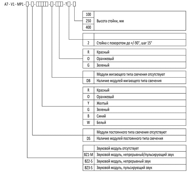 Пример заказа: A7-V1-MP1-BZ2-S-DS-ROG-T-100 (Светосигнальная колонна красный-оранжевый-зеленый-звонок (непр. звук), стойка 100 мм).